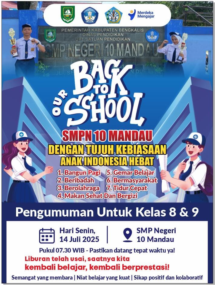Keluarga besar SMPN 10 Mandau mengucapkan selamat datang kepada seluruh peserta didik baru. Mari songsong masa depan dengan semangat belajar, berani mencoba hal baru, dan terus berprestasi. Karena di sinilah tempat kalian tumbuh, belajar, dan bersinar.